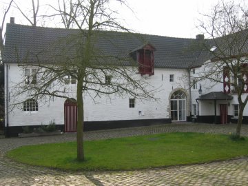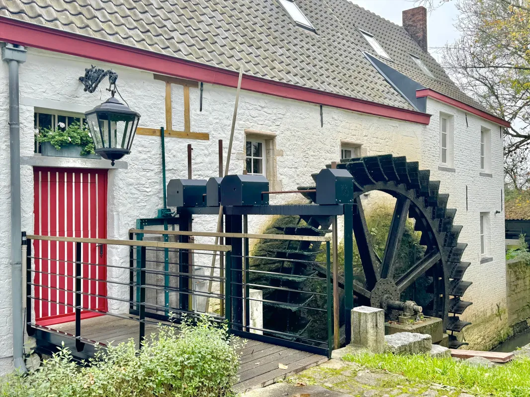 In de zuidwestelijke hoek het oorspronkelijk 17de-eeuwse molen- en molenaarshuis op rechthoekige plattegrond dat in de loop van de 19de eeuw aan beide zijden werd ingebouwd tot een L-vormig volume onder complexe pannen zadeldaken. Opgetrokken uit breuk- en baksteen met gebruik van witte natuursteen voor de hoekkettingen, deur- en vensteromlijstingen. Bakstenen erfgevel op breukstenen onderbouw met sporen van hoekkettingen, rondboogpoort met afgeschuinde dagkanten en twee kleine venstertjes met kwarthol profilering en vooruitspringende latei. Groot houten laadvenster onder sterk overkragend zadeldak met houten vleugeldeur. Poort met vernieuwd metalen en beglaasd schrijnwerk. In de oksel een uitspringend breukstenen constructie op vierkante plattegrond met aangepaste rechthoekige openingen. De gevel aan de beekkant bevat nog restanten van een breukstenen parament. Ter hoogte van het molenhuis rechthoekige deur met kwartholle stijlen en negblokken, twee kloostervensters en hoekkettingen. Ter hoogte van het woongedeelte aangepaste rechthoekige vensters onder arduinen lateien (cf. foto 1972: houten lateien) en ijzeren hekjes. De westelijke zijgevel was oorspronkelijk een topgevel en werd vermoedelijk bij de bouw van het aanpalende haakse volume (1840) aangepast tot lijstgevel. Sporen bewaard van een breukstenen parament en vlechtingen; behouden rechterschouderstuk met deksteen en een voormalig beluikt topvenstertje in zandsteen. Later aangebrachte deuropening.
