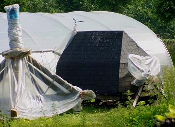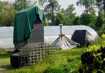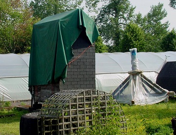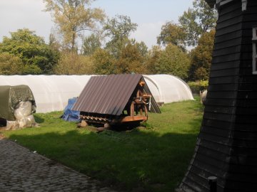 In de serre zien we de gedemonteerde trap liggen. De treden zijn wel verwijderd. De staart staat ernaast. In de serre staan ook de gelaste roeden (nagebouwd in hout) en het houten hekwerk. De roeden zijn doorgezaagd, maar het oorspronkelijke hekwerk is nog aanwezig. Voor een kleine staakmolen is dit hekwerk nog redelijk zwaar.