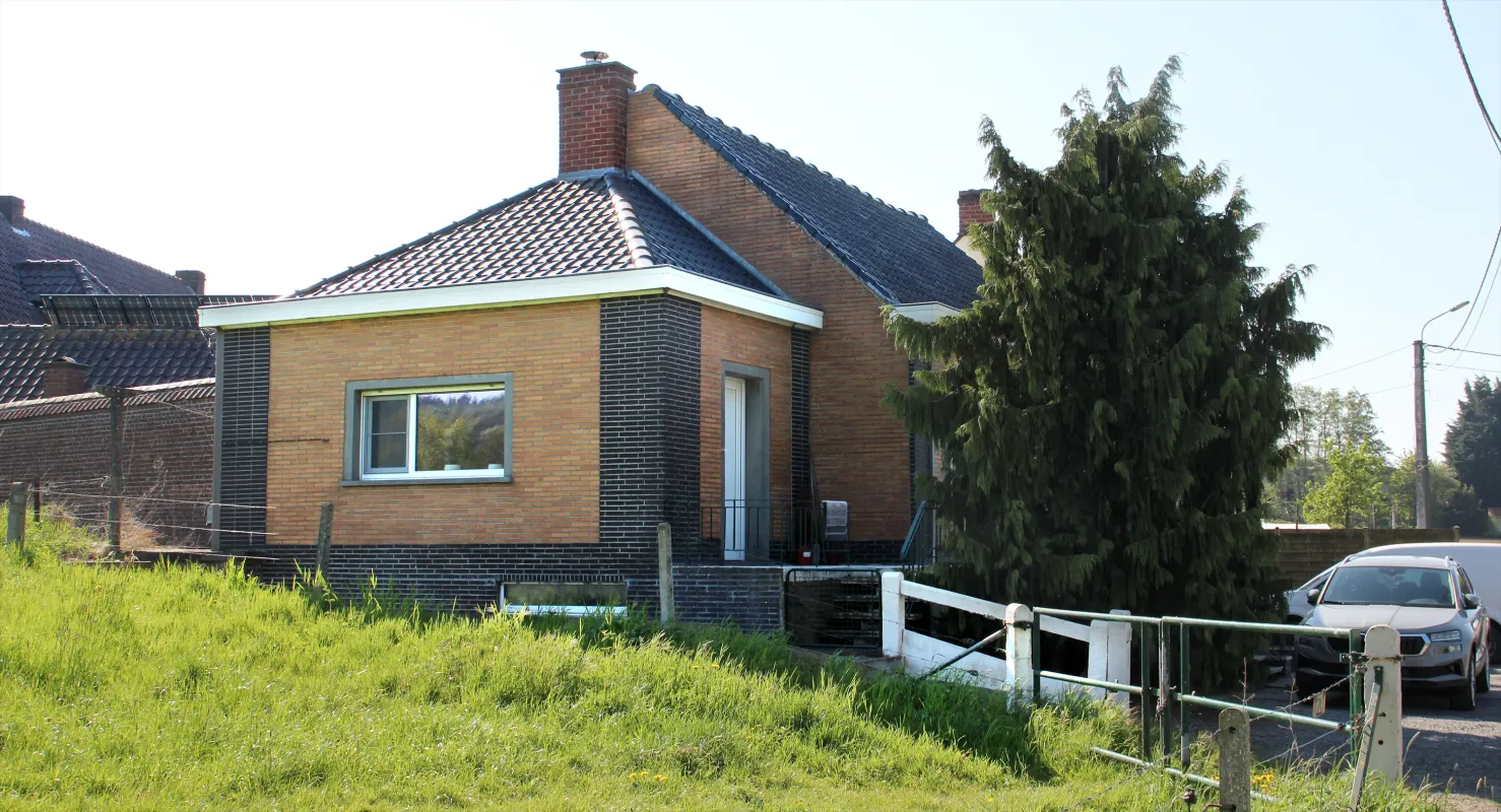 Ten oosten, deels onderkelderd woonhuis met sterk gerestaureerde gevel afgedekt door vernieuwd zadeldak (mechanische pannen) met dakkapellen en overstek rustend op modillons. Bakstenen gevel op gecementeerde plint. Rechthoekige vensters met arduinen negblokken, deels vernieuwd; sporen van tralies. Boven rechthoekige deur hergebruikt smeedijzer van bovenlicht. Zijgevels afgewerkt met vlechtingen.
