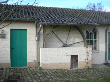 Werd in 1995 daar weggehaald toen de woning werd afgebroken en in 2000 heropgericht aan de watermolen van Sint-Gertrudis Pede. Heeft een binnenwerk van gietijzeren tandwielen die een draaistaf met 2 vleugels aandrijft in een konische karnton.