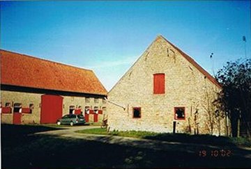 Ten westen van het boerenhuis, groot stalgebouw met schuur- en wagenhuisgedeelte, van twaalf traveeën onder gebogen zadeldak (mechanische pannen) met overstekende rand, gedateerd 1905 door middel van gevelsteen in oostgevel. Verankerde baksteenbouw. Getoogde muuropeningen. Wapenschild (gerecupereerd ?) in oostgevel.