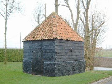 Ten noorden, vierkante (3,45 m x 3,45 m) rosmolen met horizontale plankenbeschieting op gepikte bakstenen voeling, onder tentdak (Vlaamse pannen); rechth. venstertje en deur; pennen van de ankerbalk en eindstuk in de nok, bewaard.