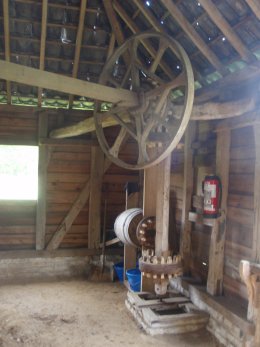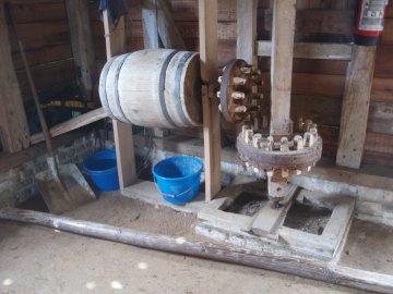 Het is een houten rosmolengebouw waarbij het paard binnen loopt.
