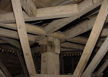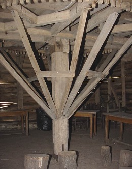In het midden draait, op een blauwe natuursteen, de spil die boven aan de ankerbalk bevestigd is; aan de bovenkant van deze spil is het kroonwiel gemonteerd. Op de spil en op een verbindingsbalk staat het jaartal 1861. In de spil komt een inkeping voor die verband houdt met de trekboom waaraan het binnen in de molen lopende paard gespannen was. Het groot wiel is opgebouwd met een kruis met dubbele armen die door verbindingsbalkjes verstevigd zijn en de spil goed omsluiten; daarenboven wordt het wiel gesteund door twaalf schoren tussen de rand van het wiel en de onderkant van de spil. Het kroonwiel heeft buitenwerks een diameter van 3,38 meter en telt 126 kammen die haaks op de rand staan.