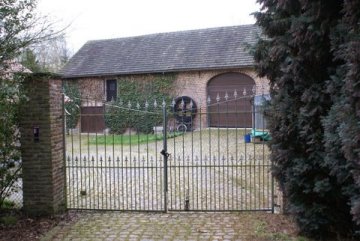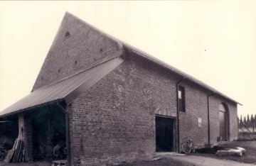 Tegenover deze vleugel, koeienstal en dwarsschuur ondergebracht in één bakstenen gebouw onder zadeldak, uit eind 19de-begin 20ste eeuw. De muuropeningen van de voormalige koeienstal zijn gewijzigd, de schuur heeft een rondboogpoort in een bakstenen omlijsting. Open schob aangebouwd tegen de linkerzijgevel.