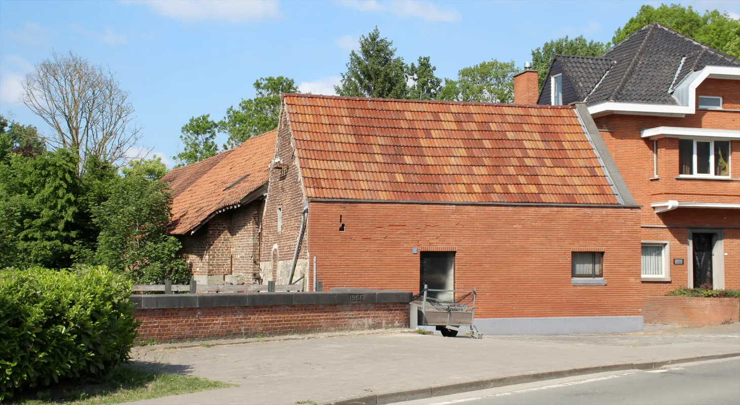 - Natuur- en bakstenen gebouw, dwars op de waterloop