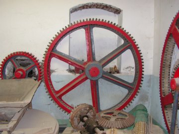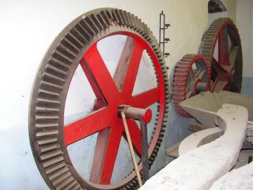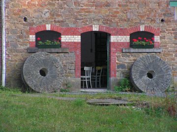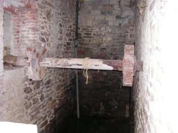 De as van het waterrad is nog in orde, maar de spaken en de schoepen dienen nog gemaakt te worden. Een oude (toch bijzondere) steen (onbekend is wélk soort steen) uit 1830 waarin de toenmalig houten as draaide, is teruggevonden op de bodem van de molenbak. Vanwege het feit dat in de watermolen de steen/graanzolder voor andere doeleinden gebruikt zal worden, hebben we gekozen voor een kleinere maalstoel, gefabriceerd door de firma Janssen uit Visé. Dit heeft tevens als voordeel dat tijdens excursies/rondleidingen het geheel overzichtelijk blijft. Met dank aan Jo Meessen, die ons de mogelijkheid heeft geboden zo’n maalstoel over te nemen. Sinds november 2004 is die dan ook in ons bezit.