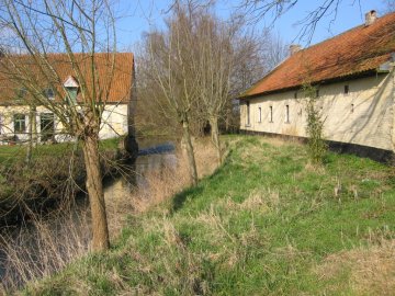 - de keermuren van de aanvoergeul zijn gedeeltelijk in hout; - waterrad (middenslagrad) weggenomen.