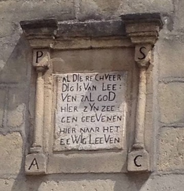 Op een gevel bevindt zich, onder een druiplijst en geflankeerd door zuiltjes, een tekstschild met als chronogram: Al die rechveerdig is van leeven / zal God hier zijn zeegen geeven / en hiernaar het eewig leeven". Of met weergave van de drukletters: "aL DIe re ChVeer/ DIg Is Van Lee/ Ven zaL goD/ hIer zYn zee -/ gen geeVen en/ hier naar het/ EeWIg LeeVen". Hiermee wordt het jaartal 1842 aangeduid. Mogelijk gaat het om een hergebruikte oudere steen bij een aanpassing van deze gevel.