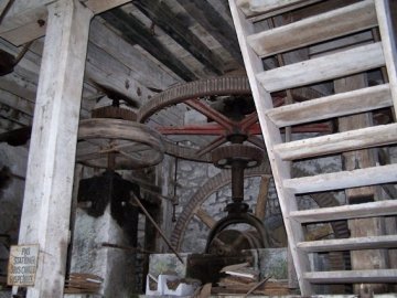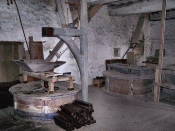 In de linkervleugel van dat eerste gebouw waren er twee maalstoelen (thans verwijderd). Zij werden vroeger aangedreven door een (thans verwijderd) groot metalen waterrad (diameter: circa 10 m) dat beschermd werd door een schuin afdak. De hogergelegen verdiepingen deden dienst als graanzolder.