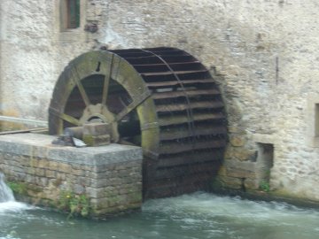 Située au bord du Ton, la roue à aubes est intégrée dans un ensemble de constructions réaménagé aux XVIIIe et XIXe siécles. En mémoire du passé, l'intérieur du logis conserve la machinerie qui a servi à actionner la scie circulaire à cadre pendant plus de cent ans.