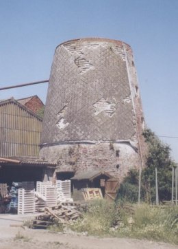 Bakstenen conische molenromp met plat dak. Sporen van een witte kalklaag aan de oostzijde sporadisch doorbroken door drie boven elkaar geplaatste luiken aan de linkerkant en deels bezet met eternietplaten aan de westzijde ter bescherming van de regen.