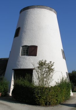 Vrij conische gewitte bakstenen molenkuip met drie bouwlagen, nu plat afgedekt. Begane grond met poort in oost- en westgevel onder eikenhouten latei en halfrond, opgevuld boogveld. Rechthoekige houten poort met twee vierkante getraliede deurlichten, vernieuwd naar bestaand model. Geschrankt geplaatste licht getoogde openingen op twee niveaus, ijzeren ramen met kleine roedeverdeling; nieuwe buitenluiken naar oorspronkelijk model.