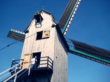 Sept années furent nécessaires pour réunir 12 millions et rebâtir le nouvel édifice. Le résultat vaut son pesant de farine. Copie conforme de l'ancien, ce moulin en bois s'élève à 14 mètres du sol. Les ailes, d'une envergure de 24 mètres, actionnent deux meules pesant chacune 800 kg! L'ensemble pivote sur un axe central pour capter au mieux le vent. A l'intérieur, un meunier diplômé refait les gestes ancestraux devant les yeux émerveillés des visiteurs en culottes courtes.