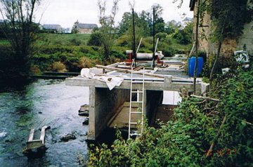 - La construction de la passe à poissons. Cet ouvrage sera établi à l'extrémité rive gauche du barrage, il se compose de 5 bassins construits en béton armé. Des échancrures créent un écoulement en cascades;