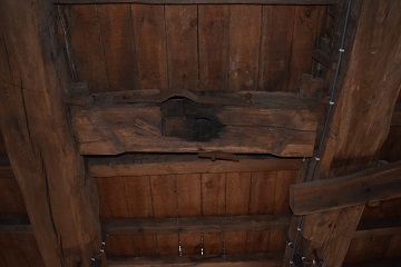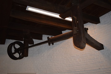 Het geheel is met bouten aan bovenliggende balken verbonden en het middelpunt van deze constructie bevindt zich ongeveer in het midden van het vertrek.
