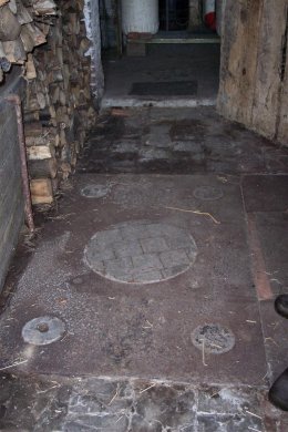 In de vloer is op gelijke hoogte met de vloer een pletsteen ingewerkt, diameter ongeveer 2 m.