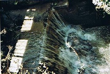 Une passerelle couverte permet d'aller directement du moulin aux vannes (sans passer par le pont). Les crémaillères sont toujours en place sur les éléments monolithiques couvrant le portique.