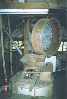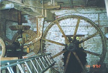 - Gietijzeren kamwieloverbrenging, 2 maalstoelen, builmachine, graankuiser