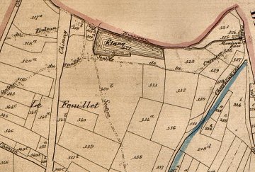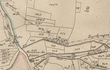 Op de kadastrale atlas van P.-C. Popp staat op: Chimay Sectie B nr. 324a - moulin à eau à farine; D109 - étang Moulin de Blanc, eigendom van: De Riquet, Joseph, prince de Chimay, propr., Chimay.