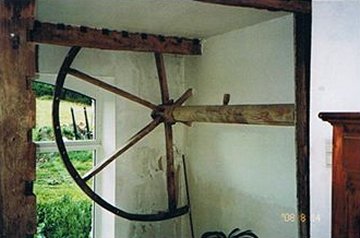 A l'intérieur, une roue (il faudrait plutôt parler d'une poulie) de fort diamètre était utilisée pour manoeuvrer les meules et se substituait donc aux potences que l'on rencontre par aileurs.