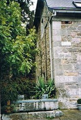 Edifié sur une dénivellation de terrain en amont du "pont romain", beau corps de logis de la 2e moitié du 18e siécle, en moellons avec angles en harpes de pierre calcaire. Un seul niveau à rue ave, à gauche, une porte à jambages en harpes sous linteau échancré à clé. A droite, trois fenêtres de même type. Boulins en briques, corniche de pierre profilée en cavet et bâtiére d'ardoises à coyau aux tuiles faîtiéres bien conservées, avec demi-croupes sur corniches de même profil. Au mur-mignon gauche, côté bief, fenêtres du même type qu'en façade réparties sur deux travées et deux niveaux. Baie de même structure au sommet du mur-pignon droit où s'ouvrent également, à hauteur de la façade, une fenêtre à encadrement de briques en arc surbaissé avec jambages à deux harpes, et, plus bas, une fenêtre de même forme entiérement en briques. Haute façade sur cour probablement de même caractére. Dépendances récentes et sans trait particulier situées en contrebas.