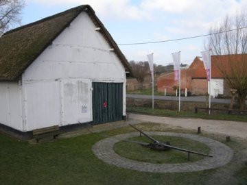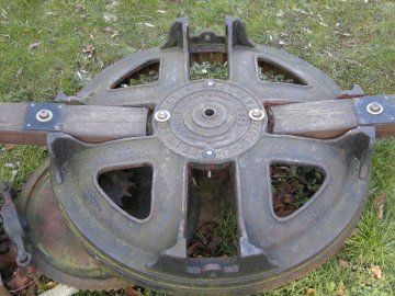 - Gietijzeren kransstuk, aandrijving dorsmachine in schuur