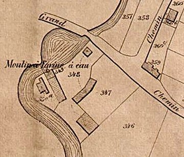 La dénivellation de la Trouille dans le village est d'environ 10 métres. Une grande ferme fut construite autour du moulin. On apperçoit celui-ci au fond de la cour, de face à droite. Les vestiges des vannes et du mur support de la roue sont visibles côté riviére.