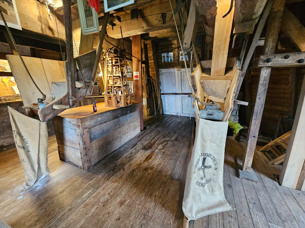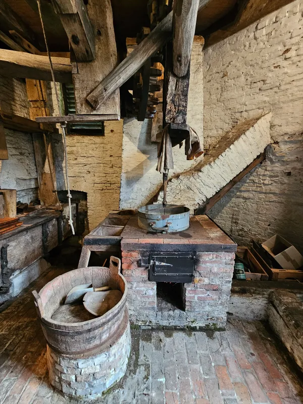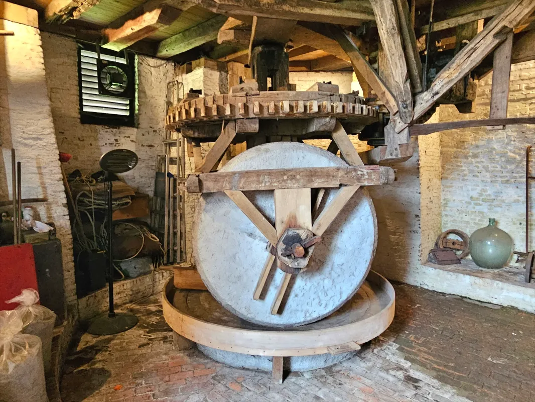 - Twee koppels kunststenen 1,6 m en 1,4 m met concentrisch zwaaipandscherpsel; kollergang van blauw arduin (diameter kantstenen 1,5 m), eiken slagbank 2,6 m. Overbrenging: 1 op 5.