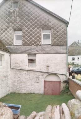 On observera toutefois que la porte du rez-de-chaussée est nettement enterrée par rapport à la voirie. A l'opposé de ces accès du moulin, une porte millésimée (1604) avec linteau décoré en accolade semble davantage correspondre à l'entrée d'une habitation qu'à celle d'un moulin. Peut-être s'agit-il de l'habitation primitive avant que le bâtiment ne soit prolongé vers la droite. De ce côté, les niveaux sont établis à des hauteurs différentes par rapport à la travée de transbordement.