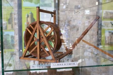Toeristisch nagebouwde tredmolen- kon 3000 kg hijsen. Deze kraan werd meestal bediend door één of twee vrouwen of twee kinderen. Soms deden ook gehandicapte mannen - die echter nog over hun twee benen en hun volledige loopvermogen beschikten - dit werk. Door het verliezen van (het gebruik van) hun arm(en) of hand(en) veloren zij ook hun werk en dus hun inkomsten, maar dankzij dit soort raderen konden zij (gedeeltelijk) verder voorzien in hun levensonderhoud.