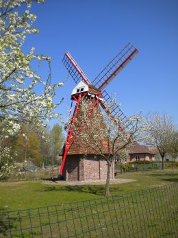 - gelaste roeden met vrij vlakke zeeg, vlucht ca. 11 meter (ca. 15 meter was mogelijk, doch om veiligheidsredenen aan weerszijden ingekort, de wieken draaien ca. 2 meter boven de grond), enkele zoom in het hekwerk