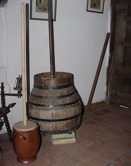 Het binnenwerk is aanwezig. Een sleeprol (diameter 18 cm) brengt een dubbele krukas en 2 boterstoters in beweging in een botervat.