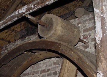 Het houten loopwiel staat binnen in de stal, heeft een diameter van 250 cm en een loopbreedte van 38 cm.