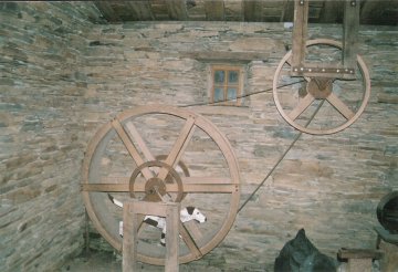 Het volledig houten wiel met aan weerszijden 6 spaken heeft een diameter van 151 cm en een loopvlak van 26 cm. Via riemen en riemschijven krijgt de blaasbalg voldoende snelheid om het vuur van de smidse te voeden.