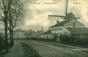 De molenwerd door Belgische genietroepen vernield eind 1914. Er bleef een Duitse oorlogsfoto bewaard waarop we de sterk beschadigde romp, zonder kap en wiekenkruis, zien.