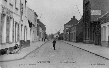 Op het kerkhof rond de kerk van Borsbeek is een grafsteen met molenvoorstelling.
