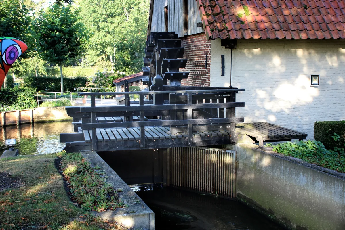 - Dwars op de waterloop, houten beschot boven het waterrrad