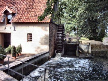 - Ook werd gekozen voor een koppel maalstenen met een kleinere diameter (10 cm kleiner dan voorheen). Hierdoor is minder water nodig om te kunnen malen. De Stiemerbeek kreeg zijn oude bedding terug, zodat het rad weer aangedreven kan worden.