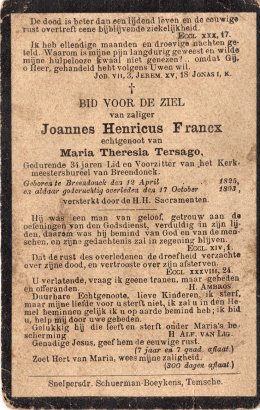 - 26.05.1895, einde vruchtgebruik: Francx-Van den Bossche Joseph Antoine (overlijden van de weduwe Tersago van Jean Henri Francx)