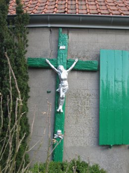 Houten groengeschilderd kruis bevestigd tegen de straatgevel van de molenaarswoning, met gietijzeren Christusbeeld geschilderd in zilver, met bovenaan banderol "INRI" en onderaan een doodshoofd met knekels.
