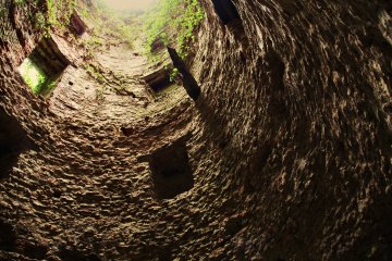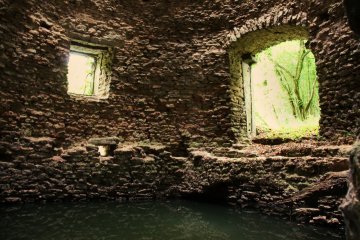 L'intérieur du moulin couvre un puits inondé. L'exhaure consistait apparemment à puiser l'eau de ce puits pour la rejeter dans un canal se trouvant sur le côté du moulin et conduisant vers la rivière. Les côtés de ce canal sont traités en belle pierre calcaire soigneusement appareillée.