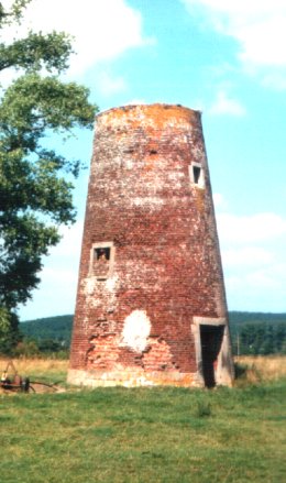 Moulin à vent en brique et pierre bleu circulaire et taluté. Ailes et toiture disparues. Dans l'axe deux grandes portes sur montants à double harpe donc le linteau droit déchargé par un arc important porte côte route. Deux fenêtres rectangulaires aux deux étages et petite baie cintrée en brique au sommet.