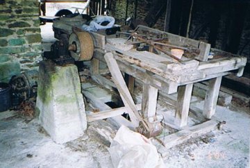 De as van het tandwiel bracht verschillende metalen vliegwielen op gang: één voor de verticale zaag, één voor de cirkelzaag, één voor de generator en enkele bijkomstige die misschien dienden voor de slijpstenen.