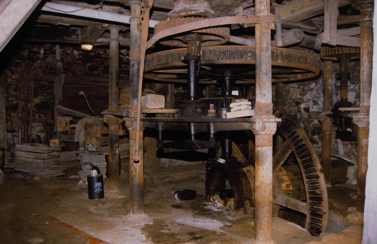 Het bovenslagrad is van eikenhout, is 3 m X 1,60 meter groot, telt 36 schoepen en is geplaatst op het uiteinde van een eikenhouten wateras van 5,32 meter lengte. Er zijn drie steenkoppels (één voor broodmeel en twee voor veevoeder) en een haverpletter.