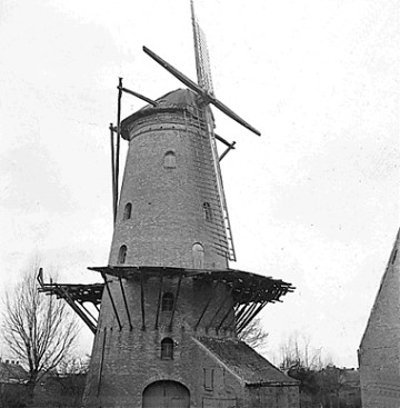 In 1944 werd de molen geteisterd door de oorlog. De schade werd hersteld. Een foto uit 1954 toont ons een gehavende molen: met enkel nog de binnenroede en de pestel van de buitenroede. Het groot gat in de houten gaanderij laat vermoeden dat de buitenroede doorheen die plek in de gaanderij was geschoten.