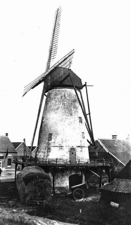 "windgraan- en pelmolen. Deze molen is in steen gebouwd en in goede staat van onderhoud. Hij heeft boven den gelijkvloer, drie verdiepingen en eene gaanderij. Hij bevat twee paar steenen geschikt tot het graenmalen, alsook twee paar steenen tot het pellen. Desnoods kunnen er twee paar stenen van elk slach 't samen gebezigd worden, doch het is niet gebruikelijk. Na aftrek van 1/3 voor kosten van onderhoud en herstel wordt zijn zuiver inkomen gebragt op fl. 330".