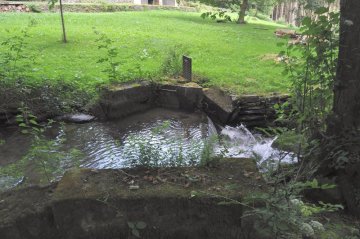 On distingue quelques mètres en amont une vanne de dérivation qui amène l'eau du tumultueux ruisseau via une conduite circulaire sous les aubes de la roue.