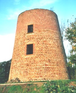 Une petite butte de terre supporte un fût tronconique élevé en grande partie en moellons de grès local. Le niveau supérieur, aux parois évidemment moins épaisses, est en brique. La brique est également utilisée pour les arcs de décharge placés au-dessus des baies et pour les montants de celles-ci. Les piédroits de la porte correspondent à des montants harpés en blocs de grès local.