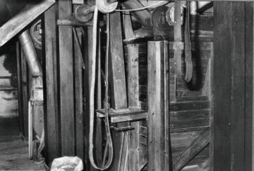 Qu'elle soit mue par un moteur électrique - un ancêtre dont le fonctionnement abscons suscite encore la perplexité des spécialistes - n'enlève rien à la poésie barbare de la machine ; une merveille monumentale dont les organes, tantôt nus et luisants, tantôt tapis dans un bel habillage de pitchpin, occupent les deux étages du moulin. Un savant enchevêtrement d'axes, d'engrenages, de poulies et de courroies qui, une fois la machine en branle, commandent la ronde cybernétique des chaînes à godets, des vis sans fin ou du «plansichter »: le blutoir mécanique dont le jeu de tamis toujours plus fins - les plus ténus étaient en soie naturelle - pouvaient alpaguer les plus insignifiantes particules de son.